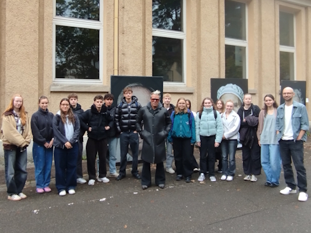 Am gestrigen Donnerstag, den 09.10.2025, besuchte der Mannheimer Fotograf und UNESCO Artist for Peace Luigi Toscano das MöGy und traf sich mit dem KS2-Geschichtskurs von Herrn Eckert. Anlass war die Ausstellung „Gegen das Vergessen“, ein Holocaust-Gedenkprojekt von Luigi Toscano, das derzeit auf dem Schulhof des MöGys besichtigt werden kann.