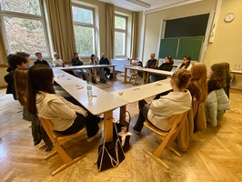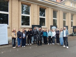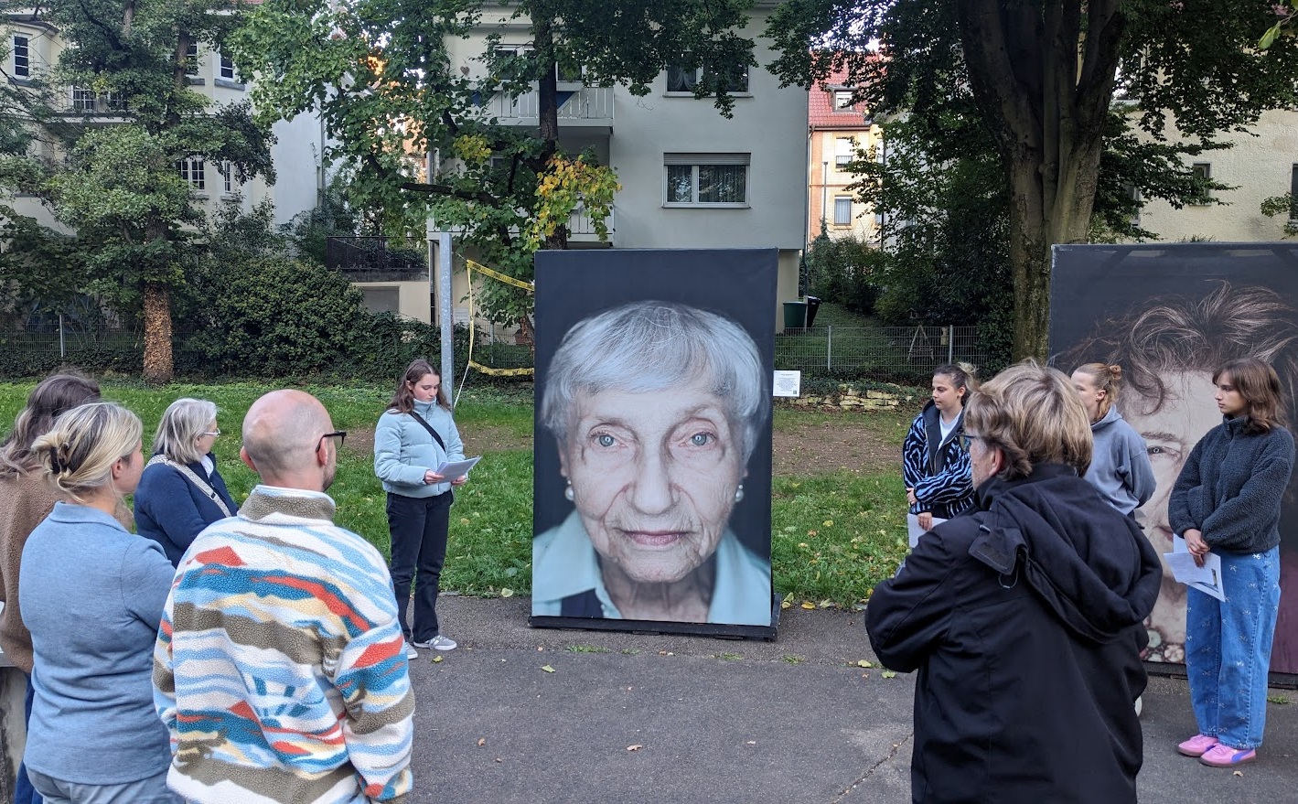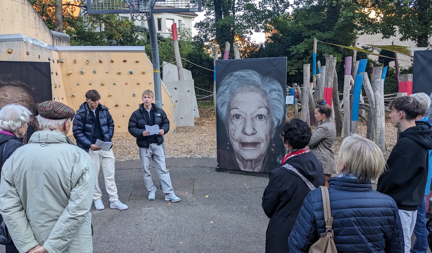 Die Schülerinnen und Schüler des Kurses von Herrn Eckert haben die besondere Aufgabe übernommen, sich in die Biografien der Überlebenden einzuarbeiten und Informationen über die Ausstellung und den Künstler zusammenzutragen. Dieses Wissen bringen sie in diesen Wochen bei Führungen ein, die sie für andere MöGy-Klassen veranstalten. Sowohl für die führenden Schülerinnen und Schüler, als auch für die Klassen, die durch die Ausstellung geführt werden, sind die Führungen unglaublich bereichernd und gewinnbringend.