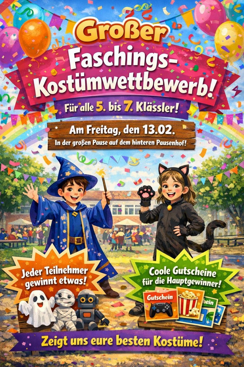 Die große Faschingsaktion der SMV findet in diesem Jahr am Freitag, den 13.02., statt. Schnappt Euch Euer schönstes, liebstes oder verrücktestes Kostüm und macht mit! Für die Klassen 5-7 gibt es in der großen Pause sogar einen tollen Kostümwettbewerb mit tollen Preisen.