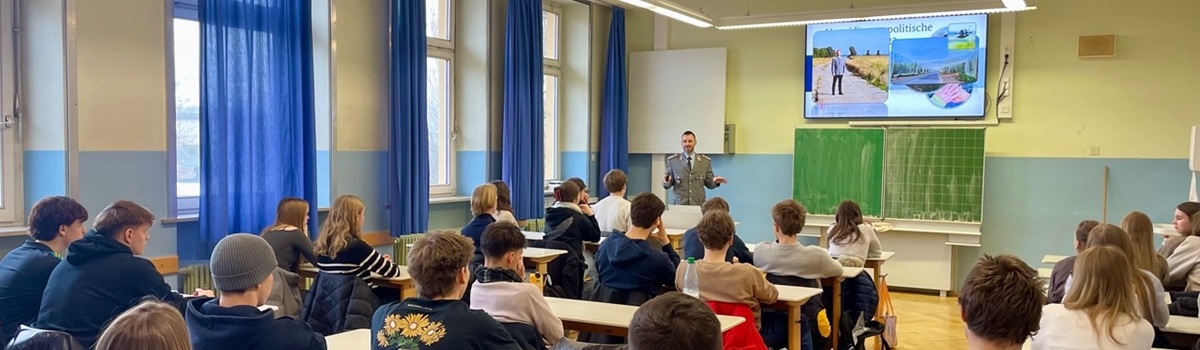 Am Dienstag, den 03.02.2025, hielt Patrick Jungmann, Jugendoffizier der Bundeswehr, einen Vortrag an unserer Schule. Zwei Gemeinschaftskundekurse der KS1 hatten die Gelegenheit, diesen Vortrag zu besuchen. Ziel der Veranstaltung war es, die Aufgaben der Bundeswehr darzustellen und über aktuelle sicherheitspolitische Herausforderungen zu informieren.
