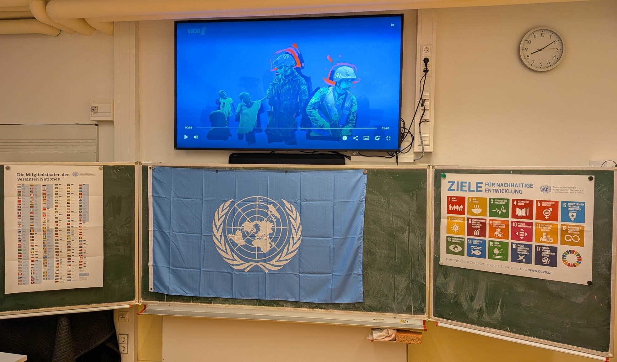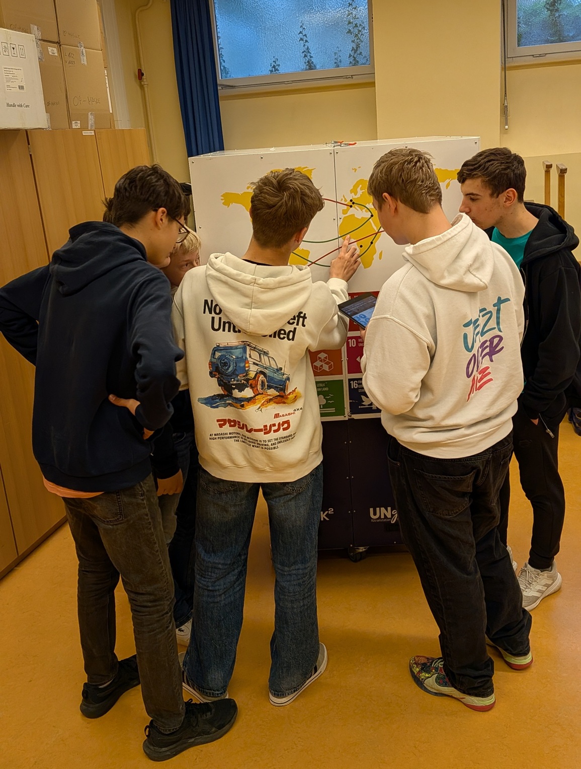 Mehrere Klassen des Mörike-Gymnasiums hatten nun im Gemeinschaftskundeunterricht die Möglichkeit, die Vereinten Nationen und ihre Arbeitsweise spielerisch über eigens dafür entwickelte Rätselstationen kennenzulernen. Basierend auf dem Prinzip eines Escape-Rooms mussten die Schülerinnen und Schüler durch das Kombinieren von Hinweisen mehrere Rätsel lösen, um die Station erfolgreich zu meistern. Da alle Rätsel auf Zusammenarbeit ausgelegt sind, gelang dies nur durch eine gute Absprache innerhalb der Gruppe. Auf diese Weise beschäftigten sich die Jugendlichen unter anderem mit den Aufgaben der Vereinten Nationen, dem Einsatz der Blauhelmsoldaten nach dem Bürgerkrieg in Liberia und den 17 Zielen für Nachhaltige Entwicklung der Vereinten Nationen.