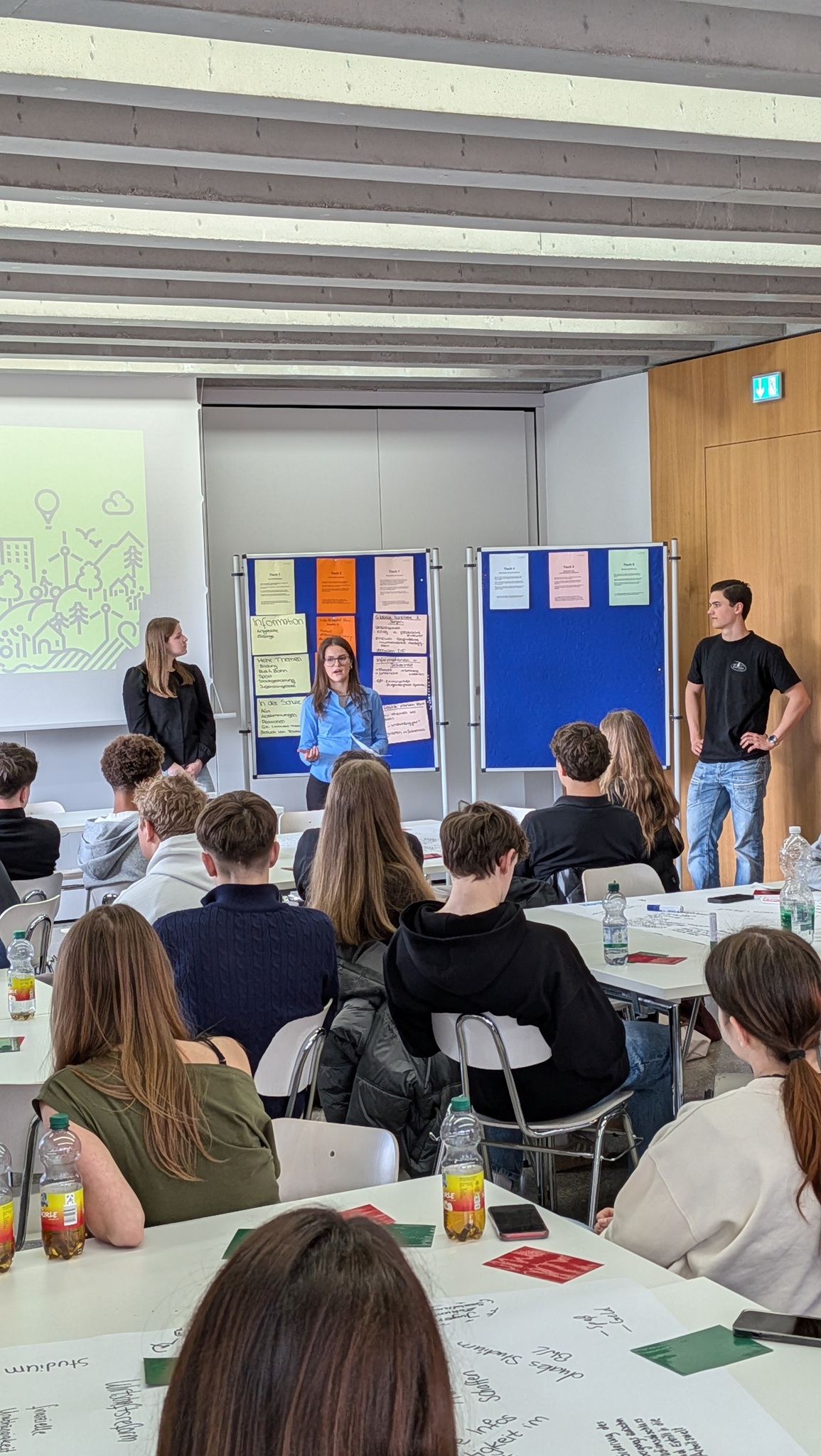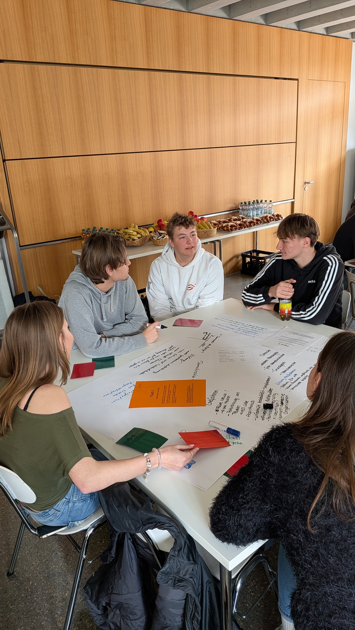 In den Gruppen tauschten sich die Teilnehmenden über ihre Meinungen und Erfahrungen aus. Sie besprachen Probleme, die sie in diesen Bereichen sehen, und entwickelten gemeinsam Ideen und Vorschläge, wie man Dinge verbessern könnte. Außerdem hatten die Schülerinnen und Schüler die Möglichkeit, mit anderen aus unterschiedlichen Klassenstufen ins Gespräch zu kommen und so verschiedene Meinungen kennenzulernen.