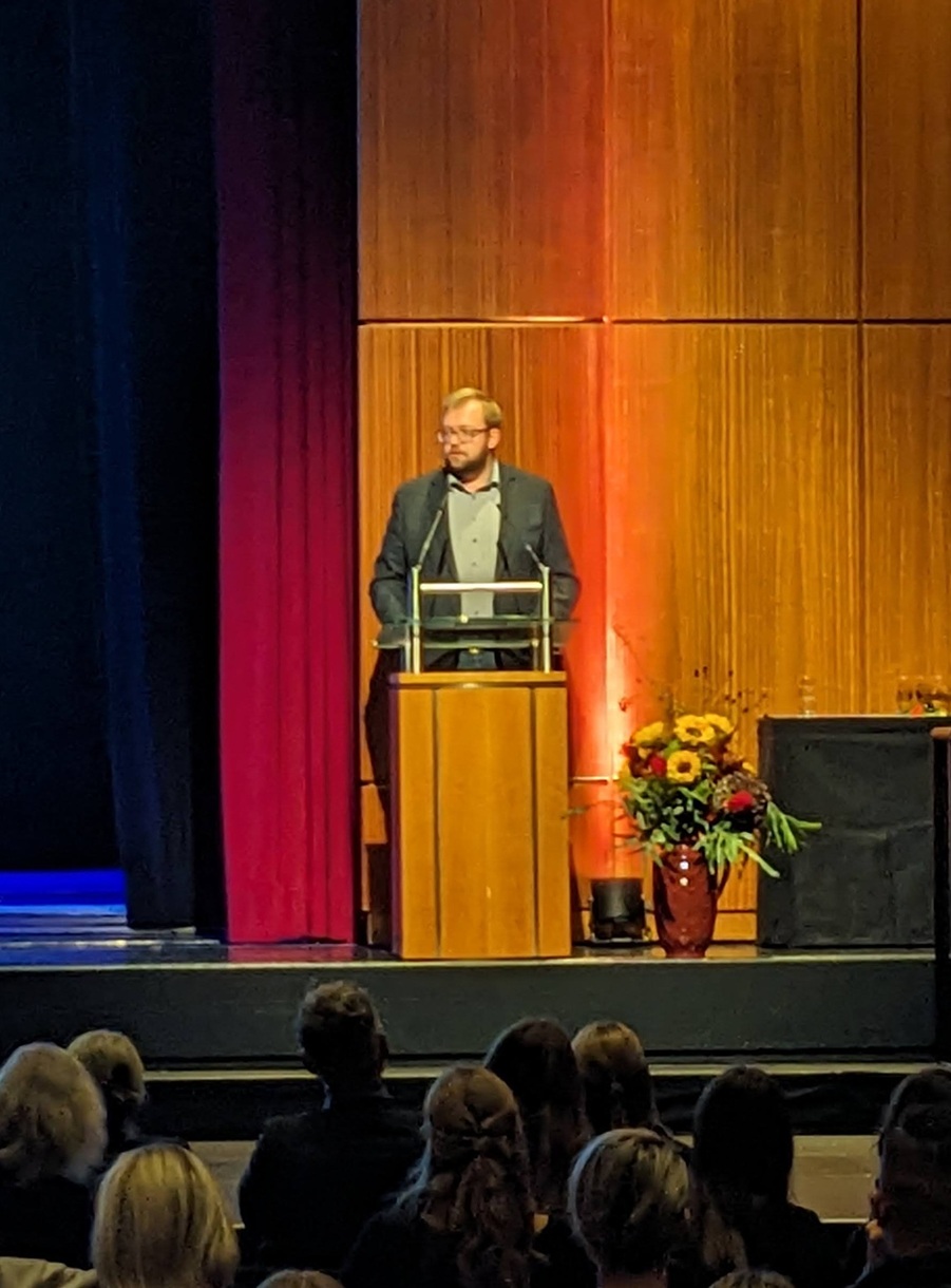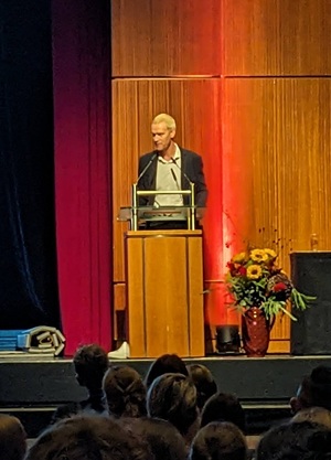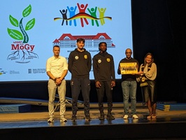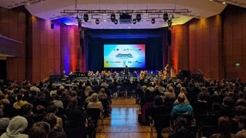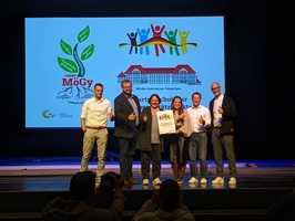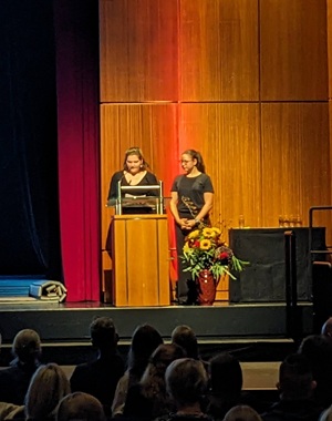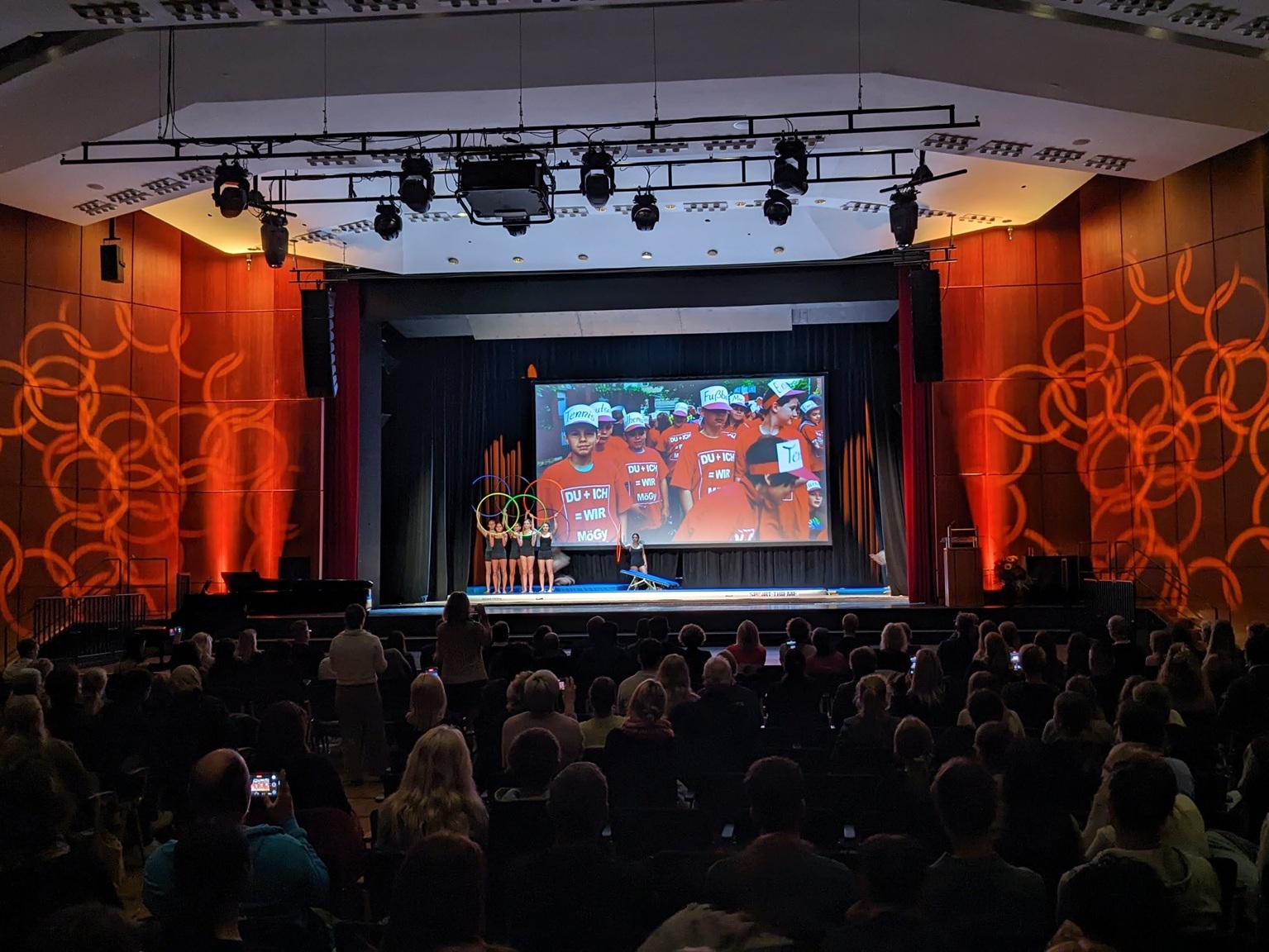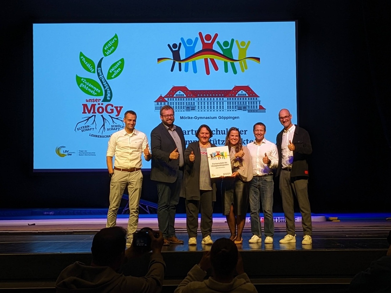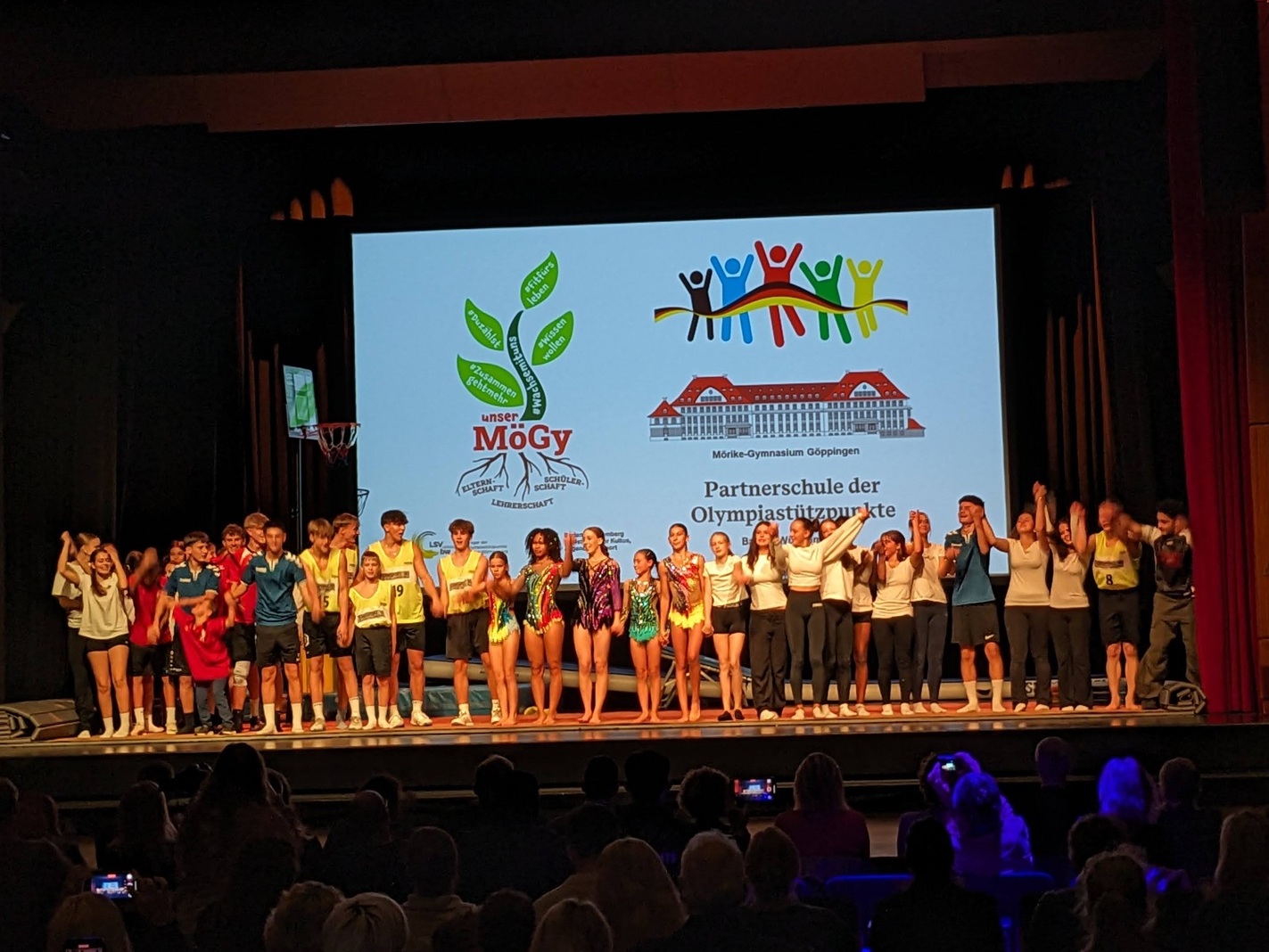 Viele Schülerinnen und Schüler, aber auch Lehrkräfte, leisteten ihren Beitrag, um den Festakt zu einem würdigen und unvergesslichen Erlebnis werden zu lassen. Das Kammerorchester sorgte für den Auftakt, eine Aufführung mit einem Film, der im Hintergrund abgespielt wurde, stand unter dem Motto „Mögy: vielfältig – erfolgreich – olympisch“ und zeigte, welche Bedeutung der Sport für die Schulgemeinschaft hat. Ein Gänsehaut-Moment an diesem Nachmittag, der mit dem Lied „One Moment in Time“ von Whitney Houston, interpretiert von der Schülerin Zoe Gaus, und leuchtenden Taschenlampen im dunklen Stadthallensaal seinen Höhepunkt fand. Der Song wurde anlässlich der Olympischen Sommerspiele 1988 in Seoul produziert. Weitere schwungvoll-sportliche Darbietungen rundeten den Nachmittag ab.
