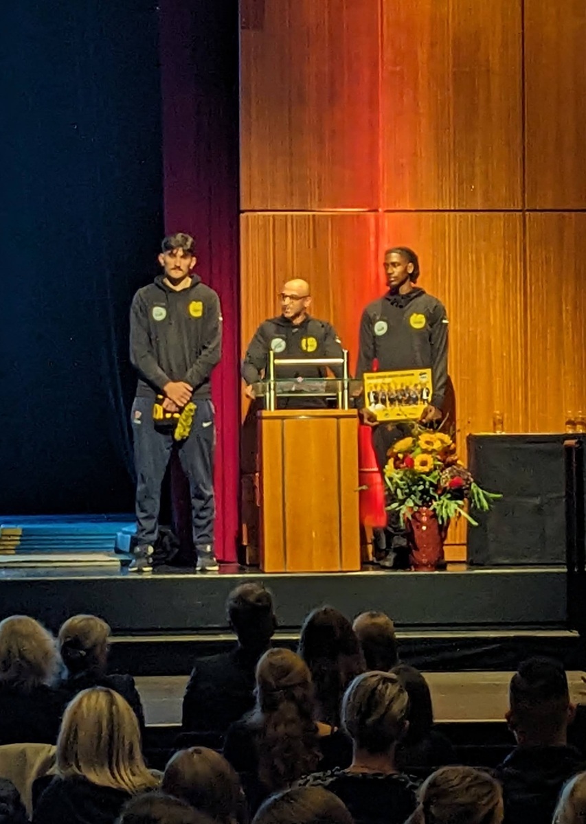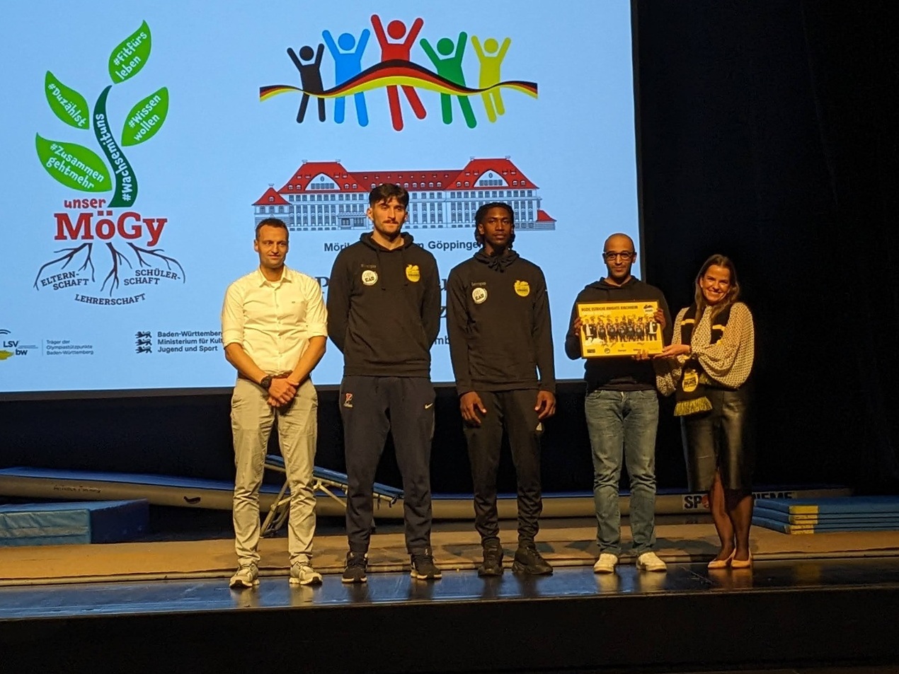 Und da es an diesem Nachmittag um den Spitzensport ging, war auch der langjährige Partner Frisch Auf Göppingen vertreten. Christian Schöne, Leiter des Nachwuchscenters, zeichnete den Weg der vergangenen Jahre nach – von einer kleinen Gruppe, die die Mittagspause zum Training nutzte, bis zu einer Truppe von fast 30 „motivierten, engagierten Jugendlichen“, die von lizenzierten Trainern betreut werden. Diese auf ihrem Weg zu begleiten, hält Schöne für ein Privileg. Und das Engagement der Lehrkräfte, Fehlzeiten der Spitzenathleten auszugleichen, für „außergewöhnlich“. Auch die Zweitliga-Basketballer aus dem Nachbarlandkreis, die Kirchheim Knights, sind Partner des Mögy und gratulierten. „Danke, dass wir Teil dieser Schule sind“, sagte Marketingmanager Mo Damiani und überreichte der Schulleiterin ein Bild samt Fan-Schal, bevor der Schulchor mit dem Song „Skyfall“ den Schlussakkord setzte.