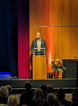 Dazwischen gratulierten zahlreiche Ehrengäste zu der Auszeichnung. Spitzensport und Schule seien kein Widerspruch, sondern ergänzten sich, meinte der Göppinger OB und machte die Bedeutung des Siegels deutlich: „Das Mögy festigt heute seine Rolle als eine der bedeutendsten Sportschulen des Landes.“ Er spornte die Schülerinnen und Schüler an, das Angebot anzunehmen und meinte augenzwinkernd: „Wer bei den Olympischen Spielen Gold holt, darf sich ins Goldene Buch der Stadt eintragen. Also strengt Euch an.“ Die Göppinger CDU-Landtagsabgeordnete Sarah Schweizer sprach von „Schule im besten Sinne“, wo Kinder und Jugendliche ihre Talente entfalten könnten – und das in der Sportstadt Göppingen mit zwei Handball-Bundesligisten.