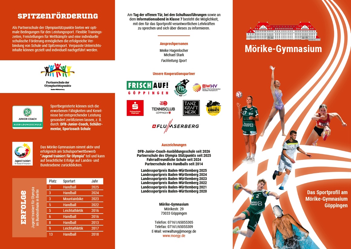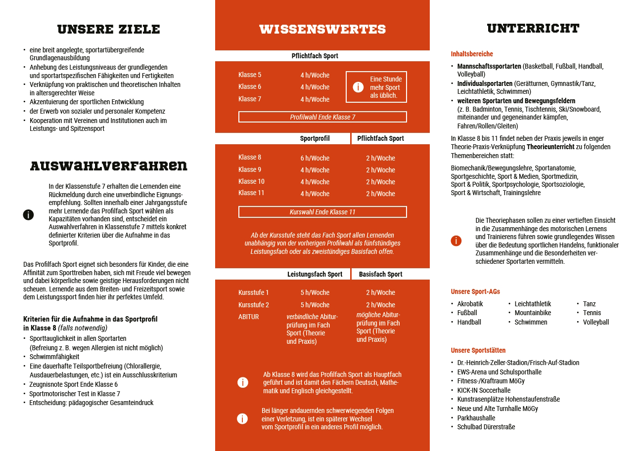 Unser Sportprofil und die vielfältigen Kooperationen, Fördermöglichkeiten und Arbeitsgemeinschaften im sportlichen Bereich stellen ein Alleinstellungsmerkmal unter den Göppinger Schulen und Gymnasien dar. Die nachfolgende Übersicht vermittelt einen detaillierten Überblick über diese besondere Profil (Flyer):